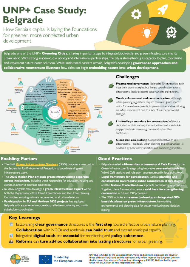 Discover how Belgrade is laying the groundwork for greener, more connected urban development. This one-pager highlights the city’s efforts to strengthen governance, foster cross-sector collaboration, and embed nature-based solutions into planning. By leveraging NGO partnerships, international projects, and emerging institutional reforms, Belgrade is building the foundations for sustainable, inclusive, and resilient urban nature planning.