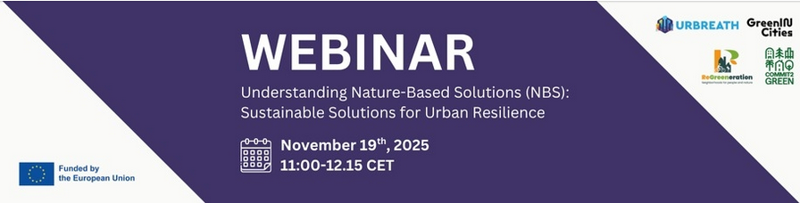Join URBREATH and partner projects GreenInCities, Regreenaration, and Commit2Green for the webinar “Understanding Nature-Based Solutions (NBS): Sustainable Solutions for Urban Resilience” on 19 November 2025, 11:00–12:15 CET.